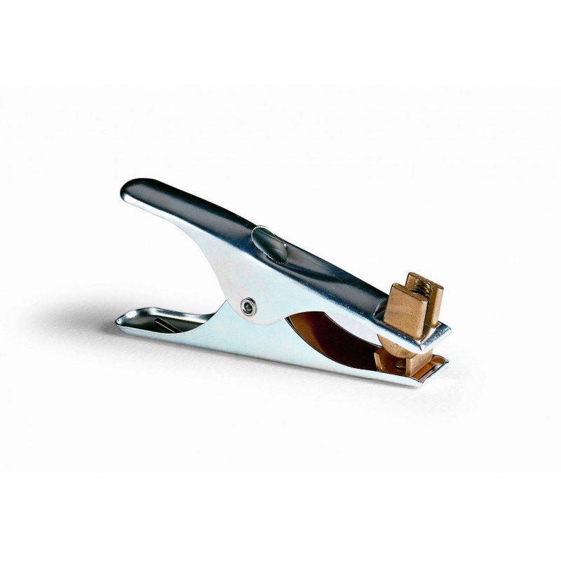 Morsetto di massa con struttura in acciaio stampato, contatti in ottone shunt in rame. Fissaggio del cavo a vite direttamente sulla zona di contatto.