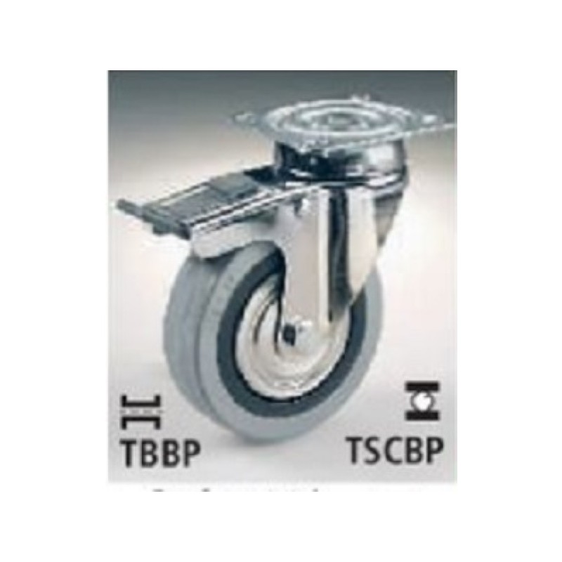 Ruote con nucleo in polimero termoplastico, supporto in lamiera stampata e cromata. Anello in gomma piena grigia antitraccia con dischi parafili. Mod. TBBP